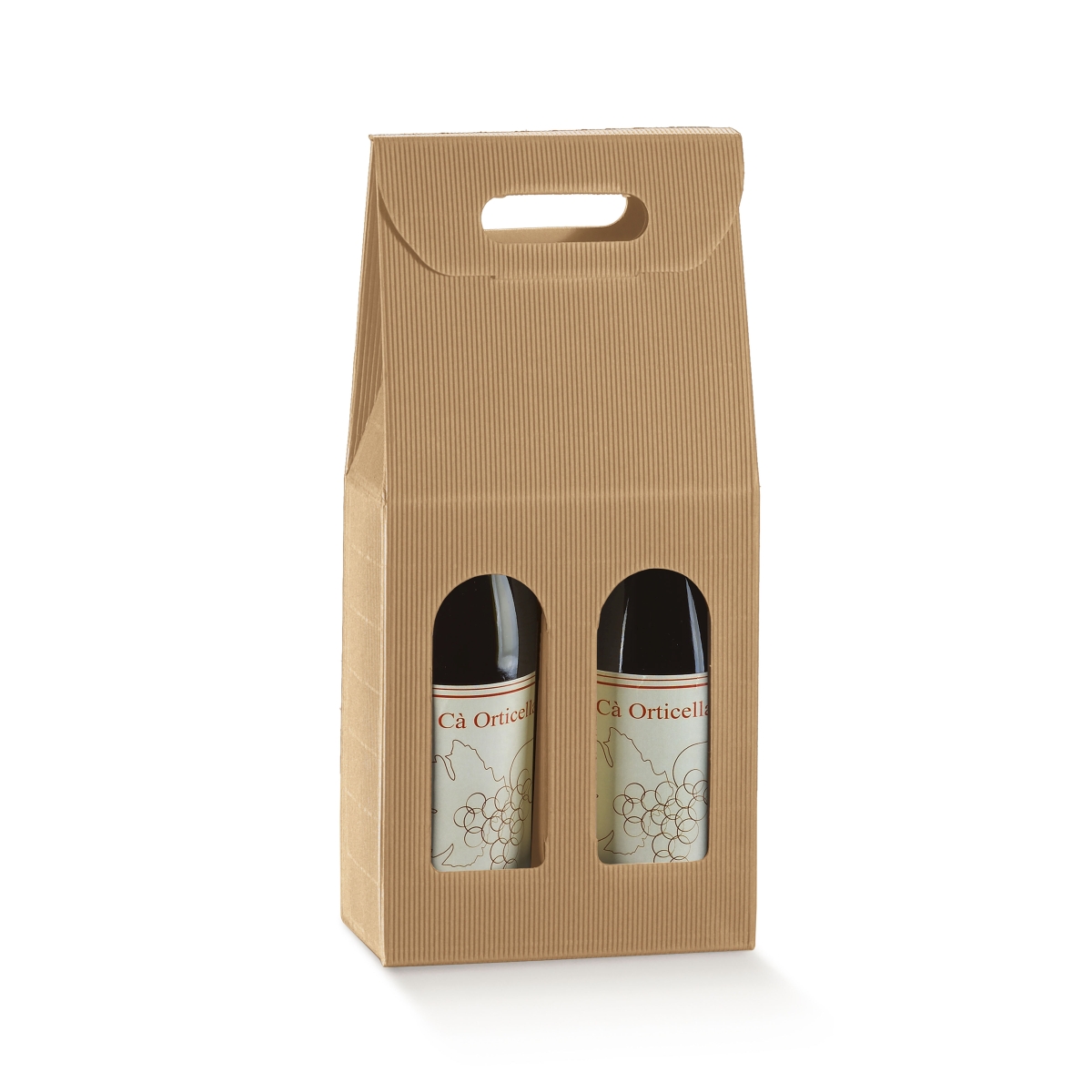 Flaschenkarton für 2 Flaschen mit Tragegriff und Fenster stehend braun (180x90x385 mm)