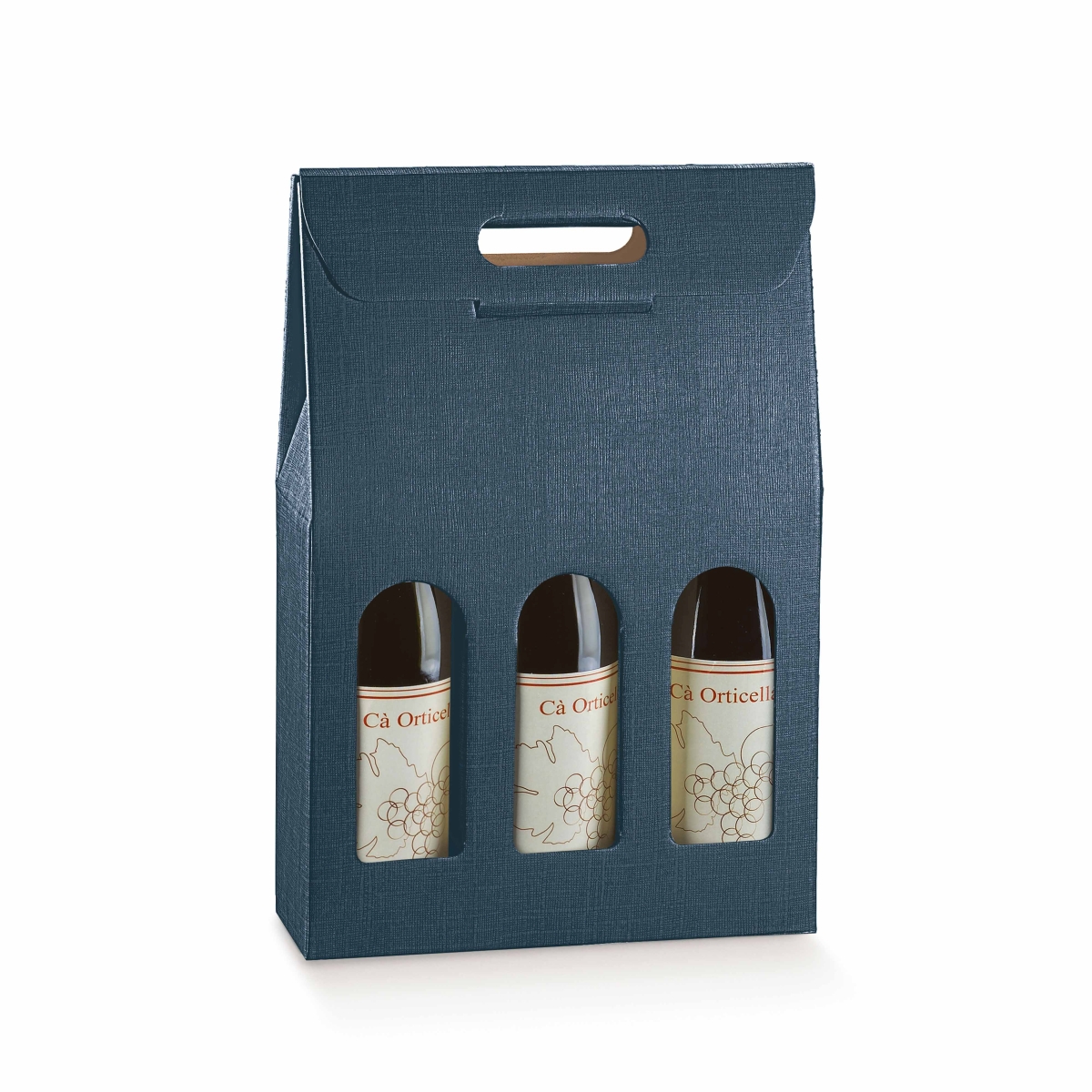 Flaschenkarton für 3 Flaschen mit Tragegriff und Fenster stehend blau (270x90x385 mm)