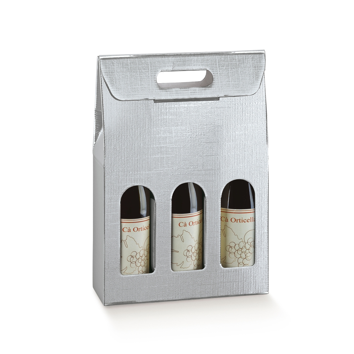 Flaschenkarton für 3 Flaschen mit Tragegriff und Fenster stehend silberfarben (270x90x385 mm)